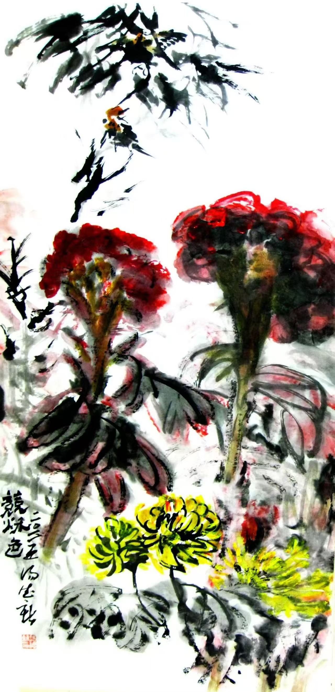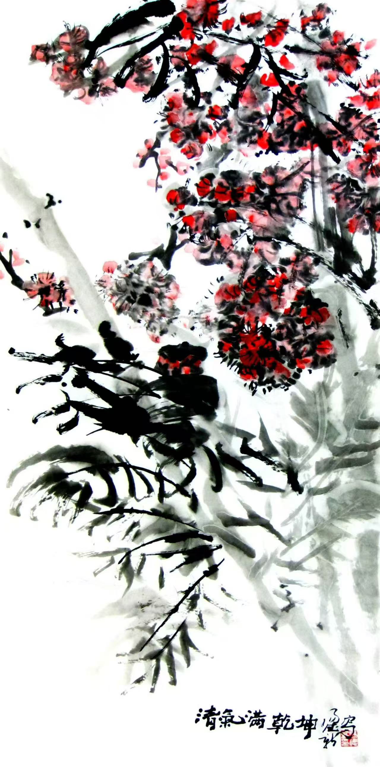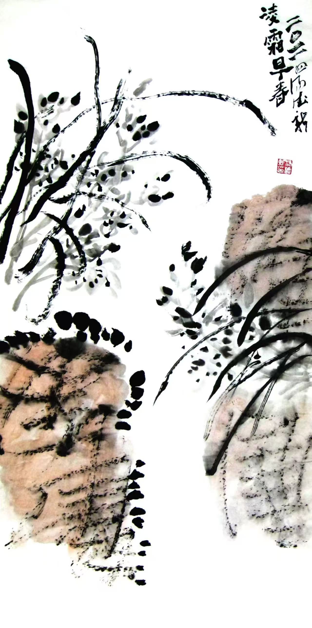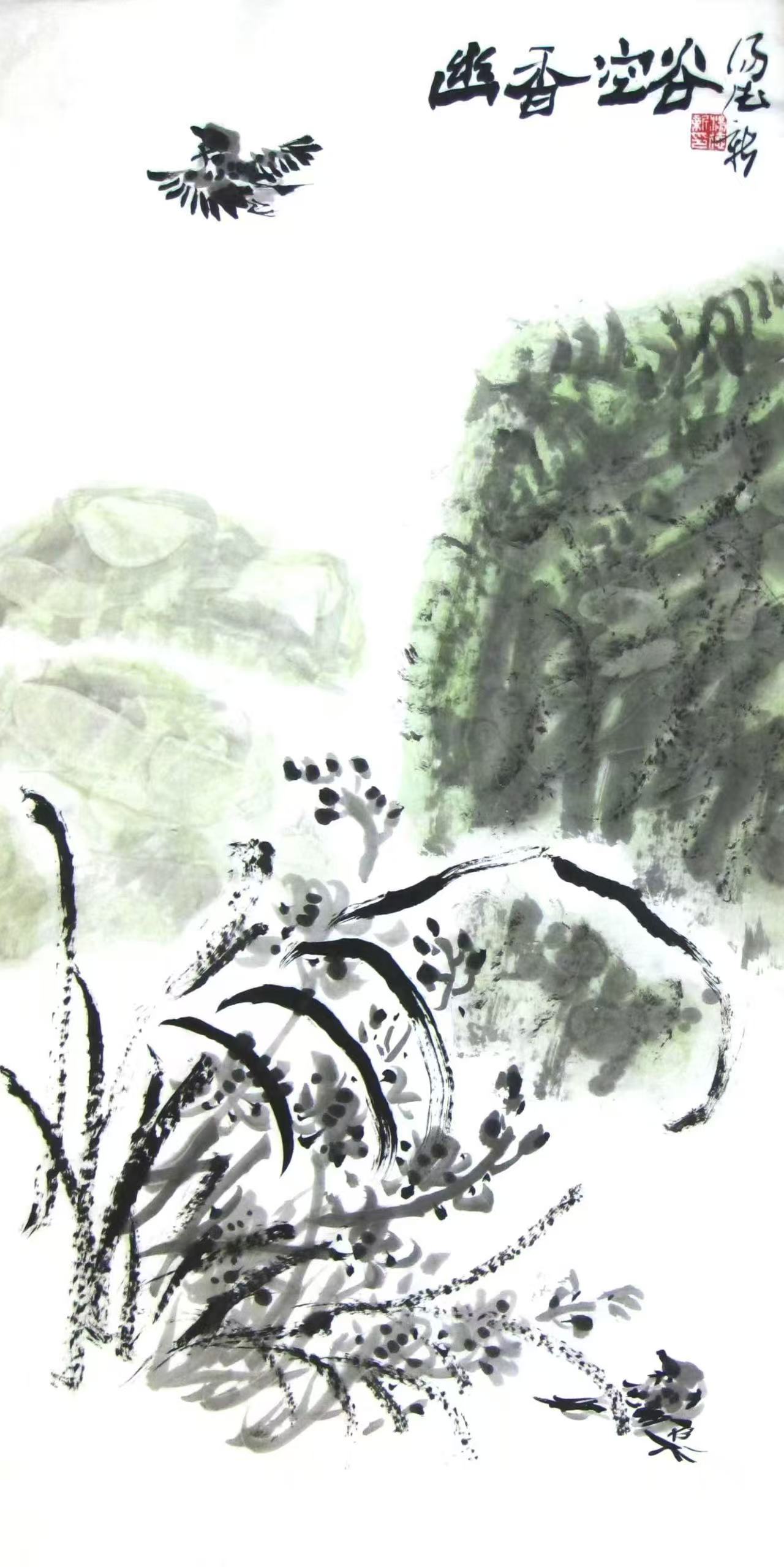 汤德新对传统题材的当代诠释,是其连接传统与现代精神的重要路径。兰草、梅花、雄鹰、山水,这些都是中国画中经典的传统题材,承载着古人的隐逸情怀、高洁追求与家国情怀,在传统创作中,这些题材多遵循固定的表现范式,如兰草多表现“幽谷无人”的隐逸之美,梅花多表现“傲雪迎春”的坚韧品格。汤德新在创作中,并未摒弃这些传统题材的文化内涵,而是以当代的视角对其进行重新解读,打破传统范式的束缚,让传统题材与当代精神产生深度共鸣。