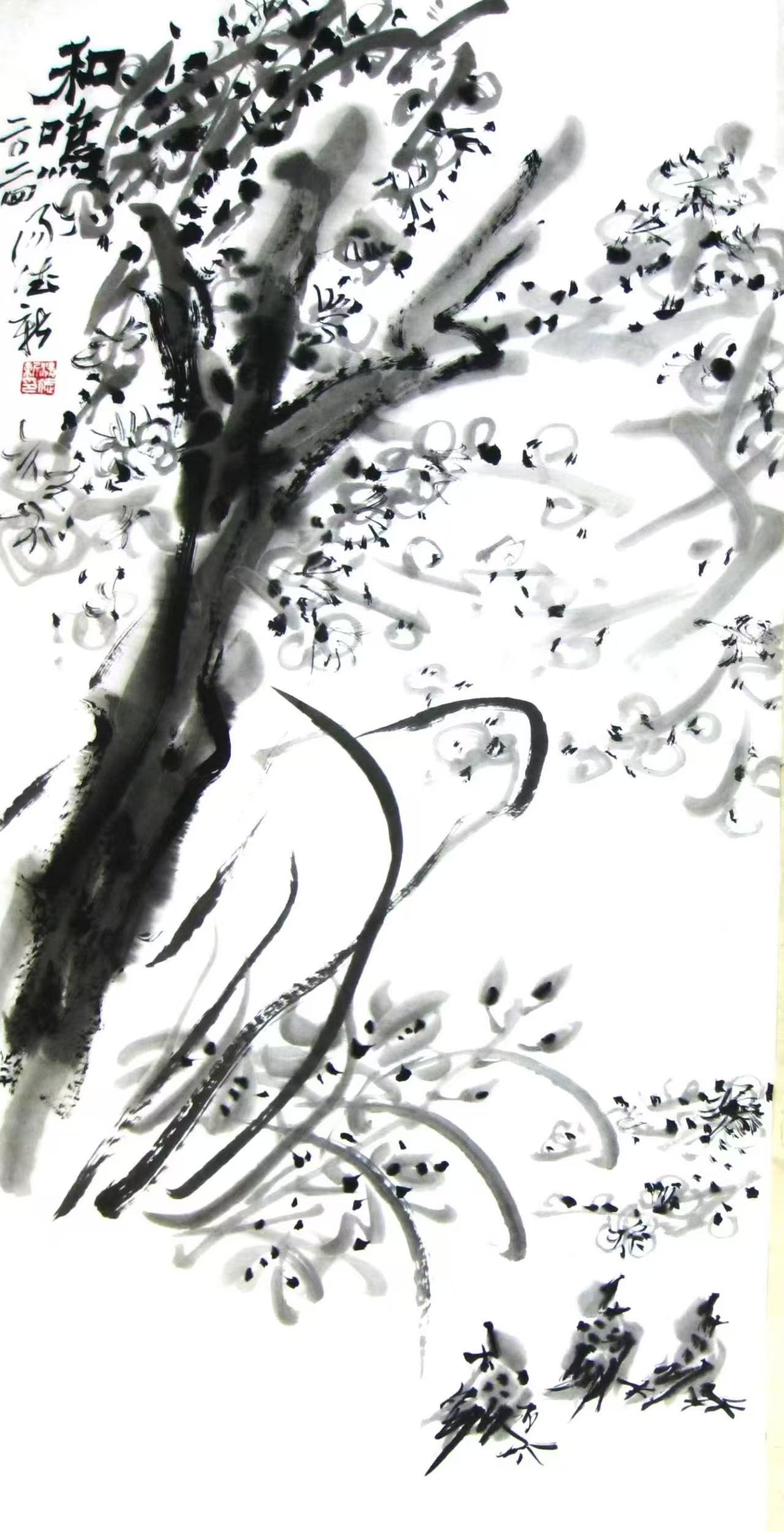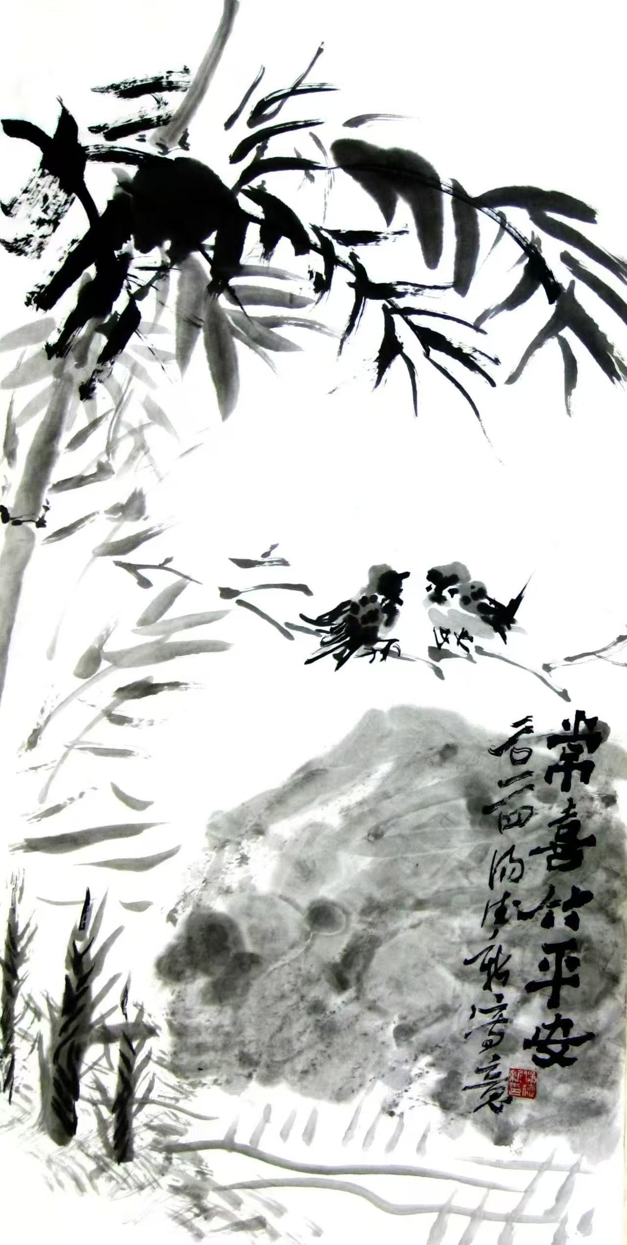 在《墨韵禽鸣》系列中,他以“水破墨”的技法为核心,先在宣纸上绘出浓墨轮廓,再以清水精准滴入浓墨之中,利用宣纸的吸水性,让清水与浓墨自然融合、晕染,在宣纸上形成自然、灵动的纹理,而这些纹理恰好成为禽鸟羽毛的天然形态,细腻而逼真。在这一过程中,汤德新严格把控清水的滴入位置、数量与速度,引导水墨晕染的方向与范围,让偶然性的晕染效果始终围绕画面的构图与主题展开,既保留了水墨晕染的自然流动性与灵性,又避免了偶然性带来的画面混乱,让水与墨的融合成为一场可控的“化学反应”,每一次晕染都是自然与人工的完美结合,让画面在自然中见匠心,在偶然中见必然。