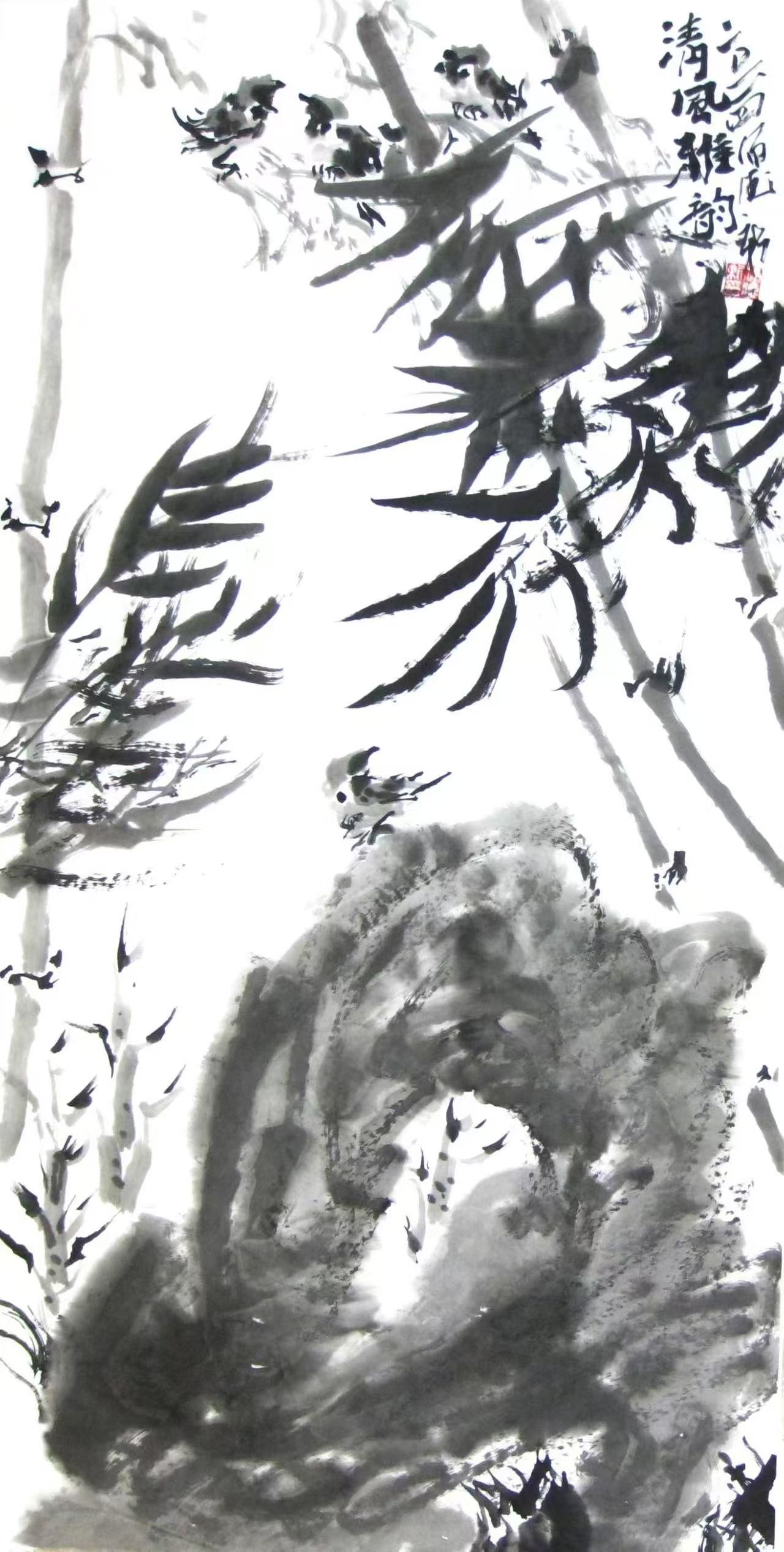汤德新对墨色的运用,根植于黄宾虹“五笔七墨”的理论精髓,却又在实践中实现了创新性突破,其核心在于打破传统墨色的平面性,赋予墨色三维空间的塑造能力。他深谙墨色的层次变化,通过浓、淡、干、湿、焦的精准把控,让墨色在宣纸上形成丰富的渐变层次,构建出“黑-灰-白”的视觉阶梯。在《兰石图》中,这一创作思路得到了淋漓尽致的展现:他以淡墨轻染山石基底,让山石在朦胧中呈现出温润的质感与深远的空间感,成为画面的视觉底色;以中锋浓墨勾勒兰草,线条挺拔有力,兰草的疏朗与坚韧在浓墨中跃然纸上,成为画面的视觉核心;再以焦墨点苔,墨色凝重却不凝滞,为山石与兰草增添了灵动的细节。