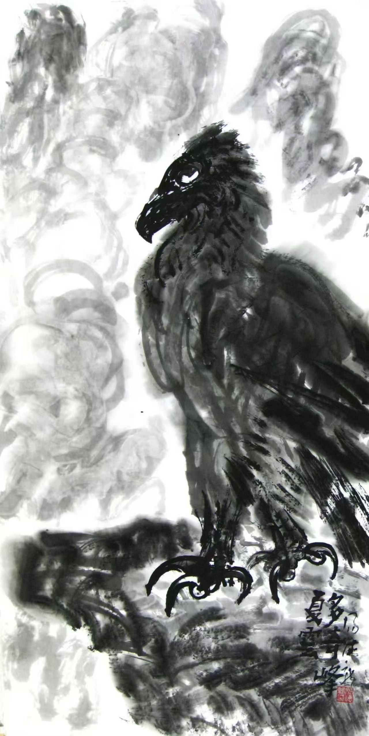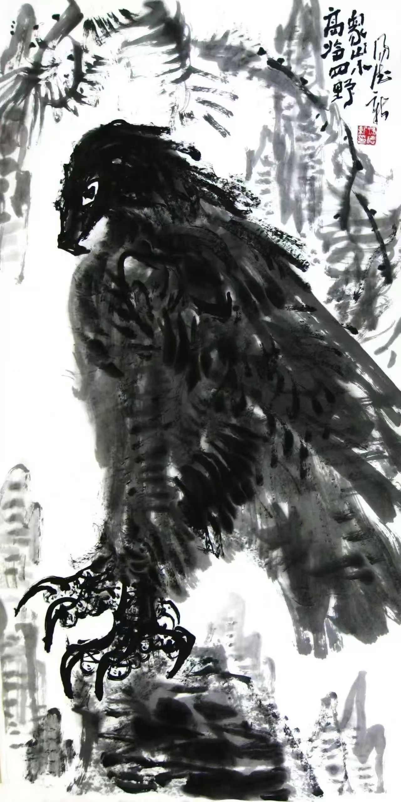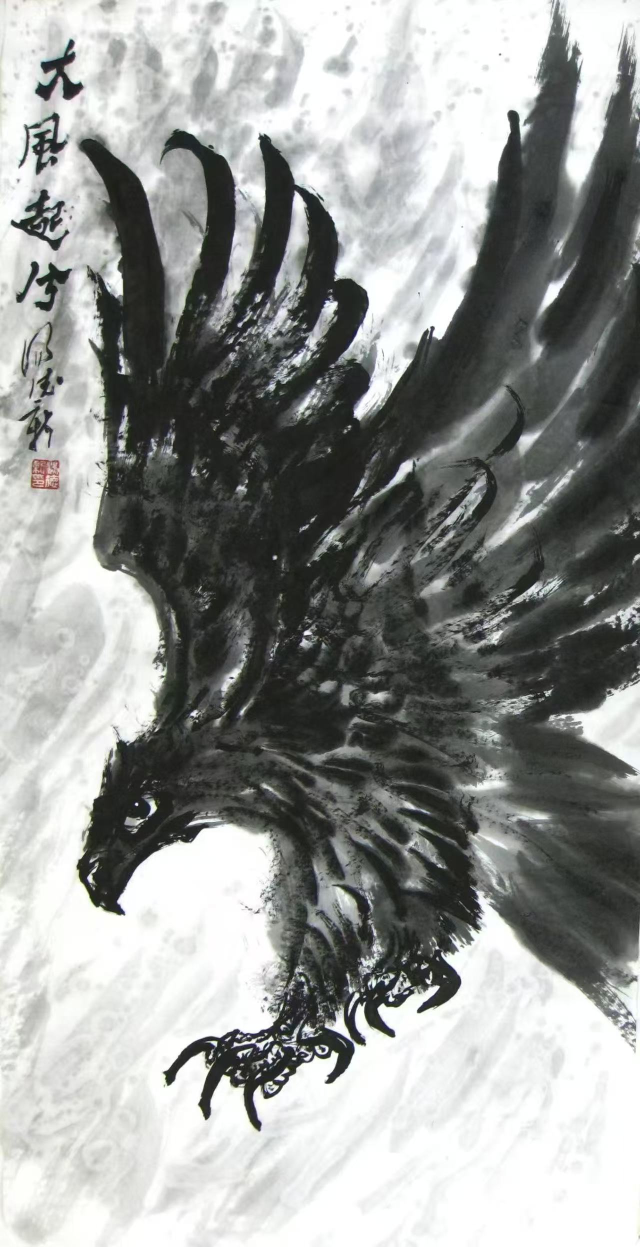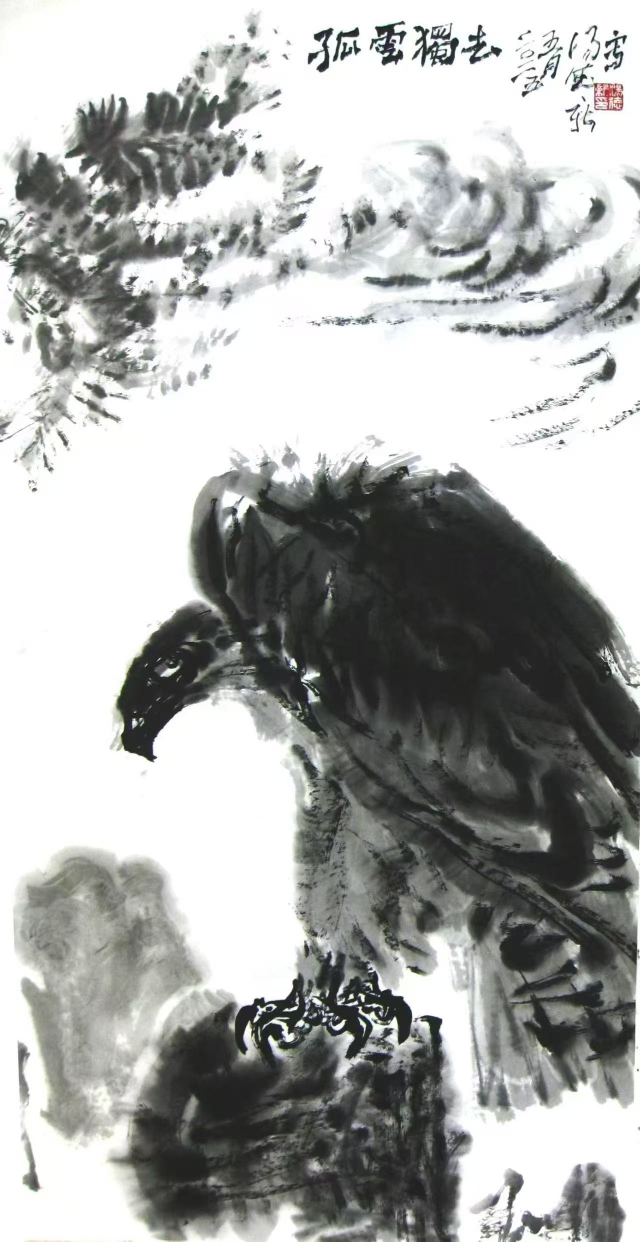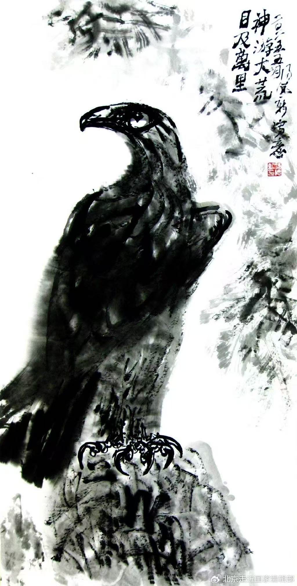 汤德新近期推出了以水墨为主、设色简淡的雄鹰题材新作,这一创作特征在2025年立夏后发布的《孤云独去》《大风拂野》《目及万里》《劲健笔力 风神顿爽》等系列作品中体现得尤为显著。充满艺术张力,效果强烈,极富笔墨情趣。