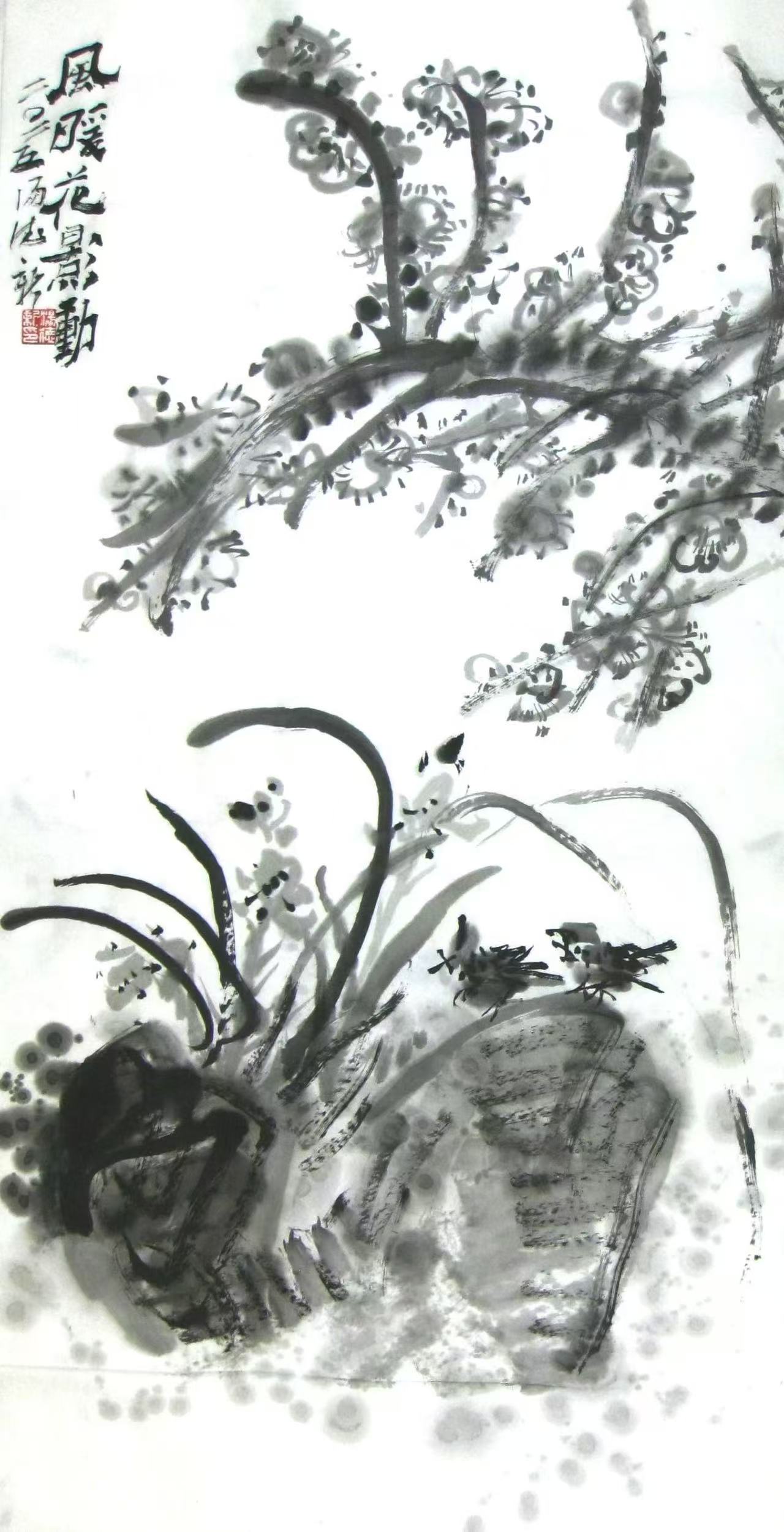 在干湿变化的墨色中,兰草不再是单纯的自然物象,而是成为生命历程的视觉隐喻,承载着对生命、时间的思考。这种处理方式,让水与墨的物质特性与当代哲学思考产生了深度共鸣,与海德格尔“存在与时间”的哲学命题形成跨领域的对话,让传统水墨媒介超越了物质本身,成为连接传统与现代、东方与西方的精神载体,实现了媒介特性的当代升华。