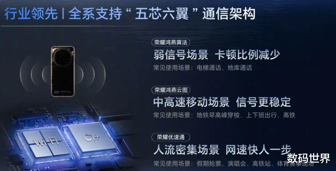 搭载行业领先的荣耀鸿雁通信系统,全场景增强,荣耀自研射频增强芯片C1+和WiFi抢网芯片,无论是弱网坏境、中高移动场景还是人员密集环境下,都比其它机型更流畅稳定。而且还获得中国电信终端通信性能综合NO1。