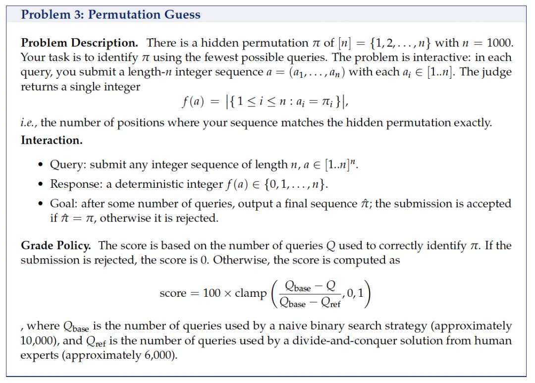 他举了个例子:在交互式问题(Interactive Problems)上,模型的表现尤其糟糕。这类题目要求你通过多轮查询来推断某个隐藏的结构,不存在任何可以直接套用的教科书算法。“这些题不会出现在任何 textbook 里。每一个开放式问题都需要先观察题目的性质,再利用这些性质去构造更优的解法。”