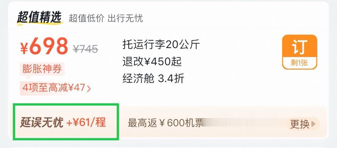 唐女士回忆,在选择价格最低的选项时,她看到了信息栏下端的一行小字“延误无忧+¥61/程”,这行小字并非不够显著,但她理解,这份服务可能已经包含在了698元的价格里,或即使要额外付费,作为附加服务,应该能在进入结算页面时取消选择。但实际进入结算页面后,唐女士才发现,系统并没有取消“延误无忧”的设计。