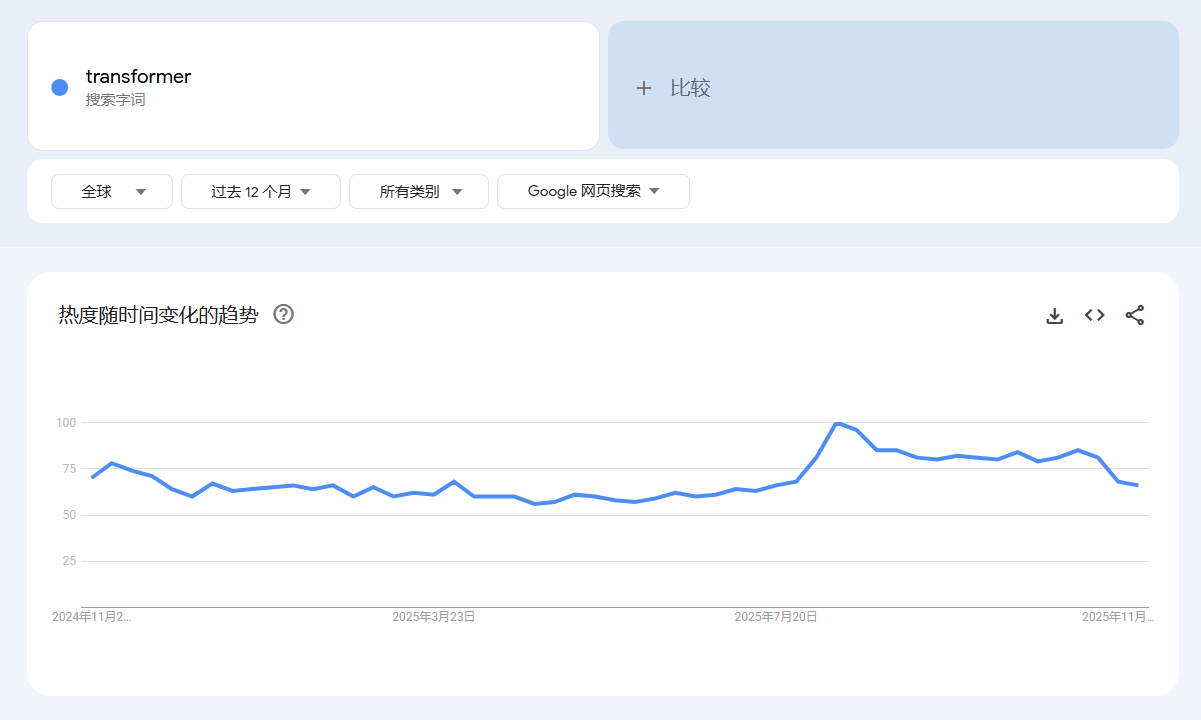 通过谷歌趋势,还可以看到“transformer(变压器)”的全球搜索热度在过去12个月里,始终维持在50到100的高位区间(100为最高热度),关注度全年在线,十分稳定。