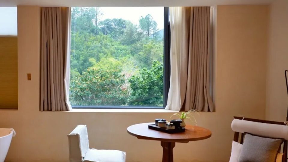 全景浴缸房,以“云起”“见山”为代表,为偏爱开阔视野的游人而设。房间拥有超大玻璃窗,将窗外景色框成一幅巨幕动态画。靠在窗边的浴缸里,仿佛悬浮于山林之上,私享一个人的竹海与落日。