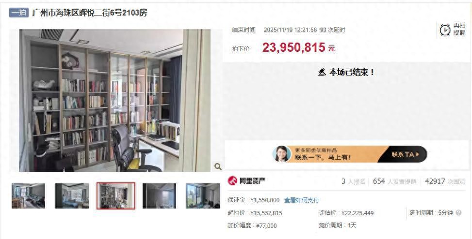 法拍公告称,该房产位于广州市海珠区晖悦二街保利天悦小区,建筑面积199.2334平方米,评估价22225449元,起拍价15557815元,保证金1550000元,由广州市海珠区人民法院挂拍,2025年11月19日正式开拍。