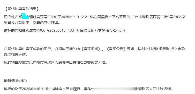 按平台规则,拍卖成交后,买受人应于网络竞价结束后10个自然日内将拍卖成交价余款缴入法院指定账户。今年1月16日,平台发布最新情况说明,称该标的物于2026年1月16日确定交易未履行,具体情况及后续安排可咨询广州市海珠区人民法院。