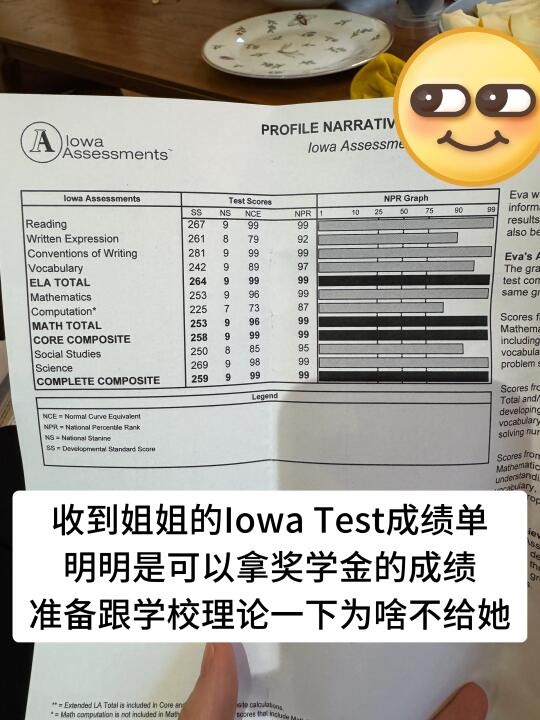 好多challenger 的家长私信我问奖学金的标准,Iowa test那几个黑色加粗体的大项最后只要都是99%就可以拿,当然学校肯定不可能承认她们只重视成绩,官方对外说是看综合表现,但其实就是只看Iowa 成绩,还有就是behavior,如果调皮捣蛋经常被找家长那种,经常拿回来conference meeting需要家长签的那种,成绩再好都不给发奖学金的。