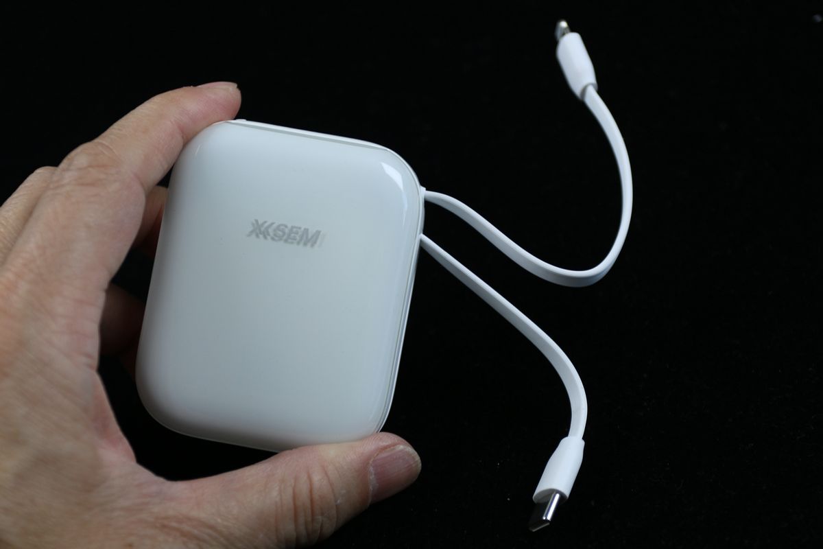 西圣移动电源PB-S带两根充电线,一根是Type-C插头,这个插头可以对外放电,也可以外接充电头对自身补充电力,另外一根是Lightning接口,用于对苹果手机充电,这根线设计成手绳状,一物二用,此外还有一个Type-C插座,可以用Type-C线充电或对外放电,包装里还附送一条TypeC-C充电线。