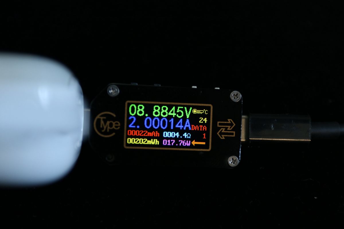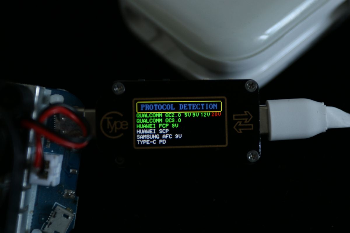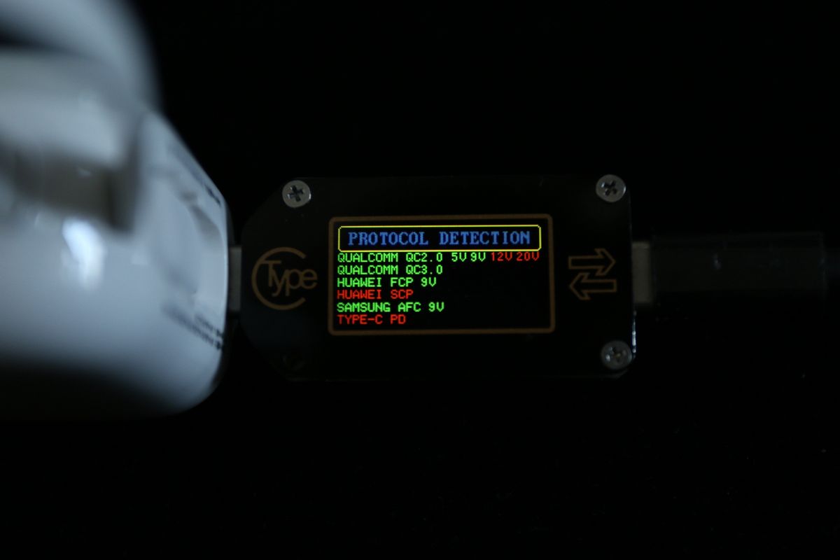 首先测试的是快充协议的支持,通过测试仪向假负载供电,可以看到支持高通QC2.0 5V\9V\12V快充协议、高通QC3.0快充协议、华为FCP快充协议,兼容性比较强。