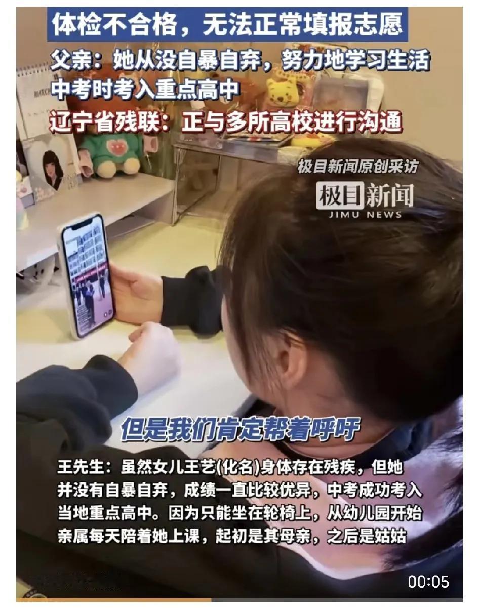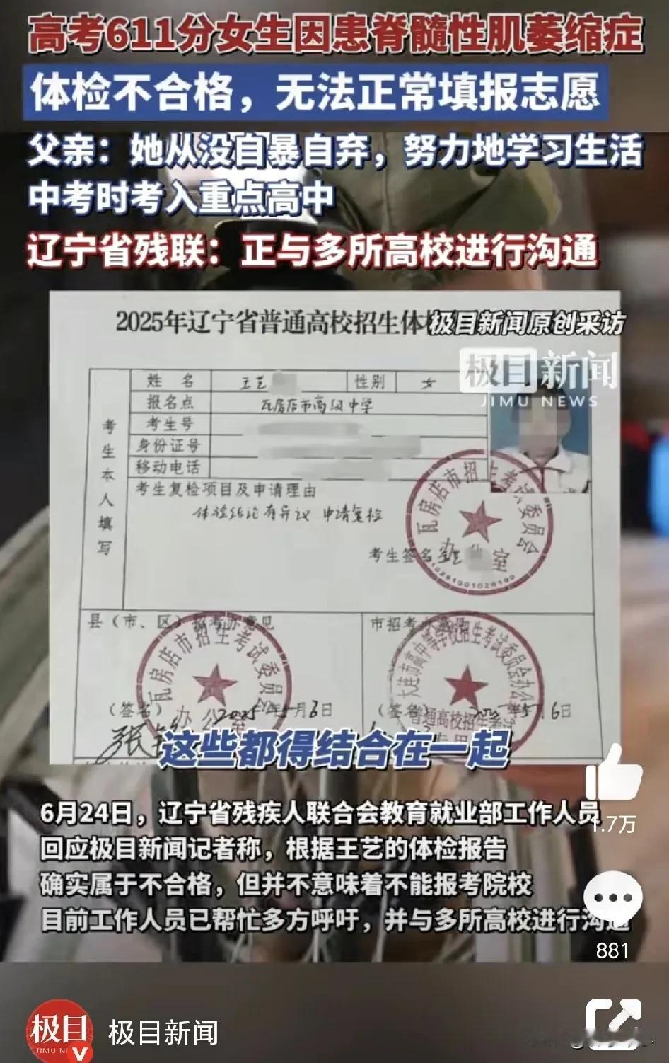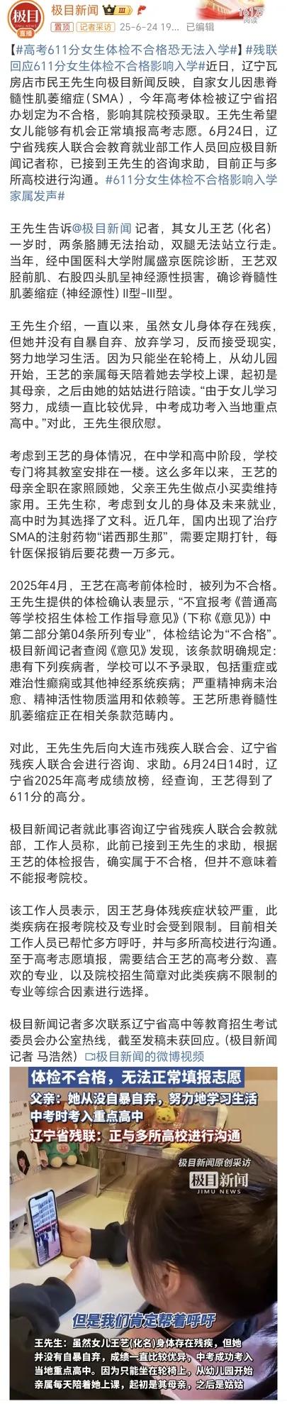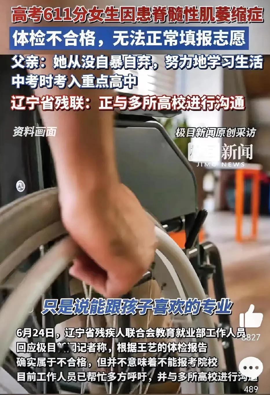 “我的女儿今年高考考了611分,但现在却不能正常填报高考志愿。” 这是一位普通家长向媒体的求助,理由是高考体检被辽宁省招办划定为不合格,影响其院校预录取。 体检为何不合格?不合格就真的入不了大学吗?我们带着这些问题一起了解一下事情的原委。 我们根据媒体公开的报道,大致梳理一下事情的经过。 考生叫王艺(化名)是辽宁的考生,她的过往既是传奇也是不幸。 王艺从1岁时,就被查出脊髓性肌萎缩症(神经源性)Ⅱ型-Ⅲ型。 通俗来讲她的症状就是双脚无法直立行走,两条胳膊无法抬动。这是她的不幸。 传奇的是王艺的家人一直都很支持王艺,她的家人把她当成正常人来看待,送她上学读书,她的家人从她上幼儿园一直读到现在。 当然王艺也很争气,她的成绩一直都很优秀。 王艺的父亲平时做点小生意维持家庭,而王艺的母亲则是全职照顾王艺的日常。 近几年,国内针对王艺的这种病出了治疗的药,只需要定期注射。 今年4月份,王艺参加了高考体检,王艺被列为体检不合格。 关键是这个体检不合格明确规定了:患有下列疾病者,学校可以不予录取。 而王艺的症状正在其中。 这就是说王艺虽然参加了高考,但有可能会出现无法正常填报志愿的情况。 于是就有了开头,王先生向极目新闻求助的事情。 6月24日,记者联系了辽宁省残疾人联合会教育就业部的工作人员,根据工作人员回应,王艺的体检确实不合格,但并不以为一定不能上大学,目前正在跟多所高校做沟通,现在已有院校回复能上。 针对王艺的这种情况,有以下几点看法。 1、高校的大门不应该直接对王艺关闭,王艺是凭借自己的努力考上来的,她的付出要比平常多太多了,她的一路是多么不易,这些都是摆在眼前的事实。 就凭她的故事,放在那个学校不是一道靓丽的风景,将会激励多少莘莘学子。 2、有些专业需要特别的要求,当然王艺也不会去填报,因为她也清楚自己不适合,但是对于适合的专业,是不是应该一视同仁呢?毕竟这些年最难坚持的日子,她都走过来了,更何况未来的路越来越好走了呢! 3、高考体检是有相关的规定,这个我们能够理解,但是不是也要考虑实际情况,综合评估,不要因为单纯的条款,就让人失去希望。 毕竟条款是死的,人是活的,规定也要合情合理。 虽然残联说目前已经有大学愿意接受,但我们不知道适不适合王艺本人,还有是不是王艺理想的大学。 所以我们还是希望高校的领导能够看到王艺的过往,好好评估一下。 对于高校的领导来说,您给的是一个机会,对王艺来说,有可能是改变她一生的机会。 查高考录取 填高考志愿 高考成绩 高考成绩 教育应守护611分残疾女生的大学梦