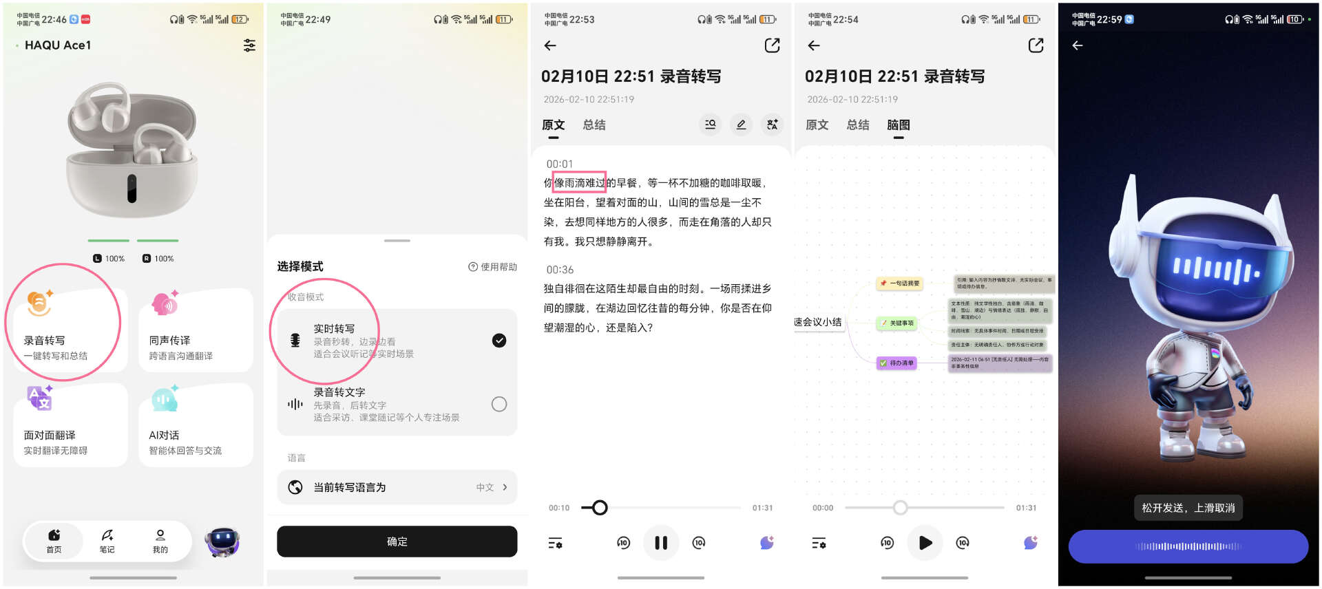 增值功能则是AI加持,录音转写、同声传译、面对面翻译、AI对话都具备实用性。我也是好奇,正好在听赵磊的《小行迹》,干脆让哈趣Ace1来转写一段歌词,整体准确度很高,只有开头的5个字是错的,后续全对。本来这个功能是给会议或者谈话准备的,还能生成脑图,非常赞,又多一个工作帮手。
