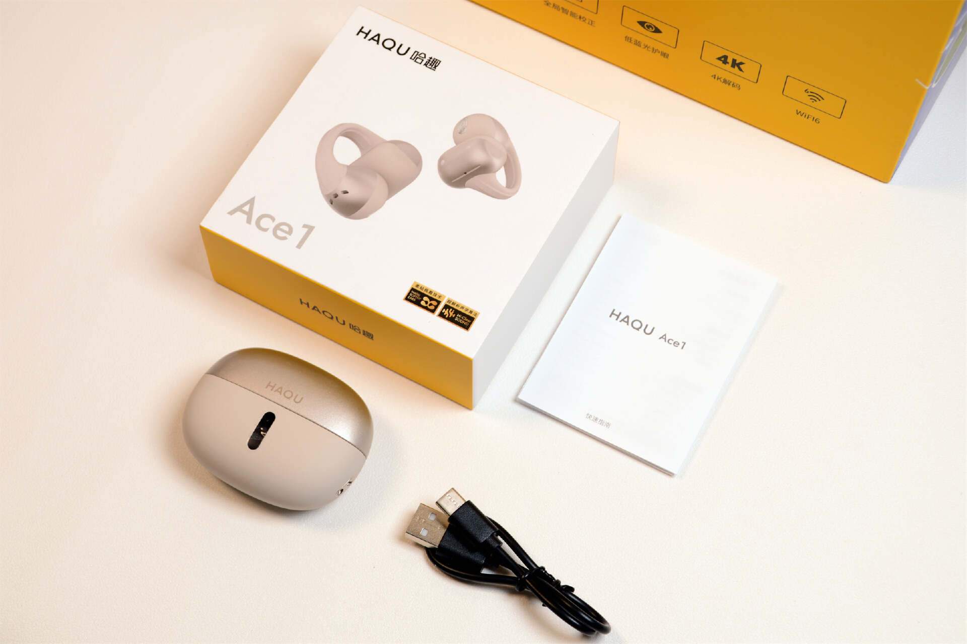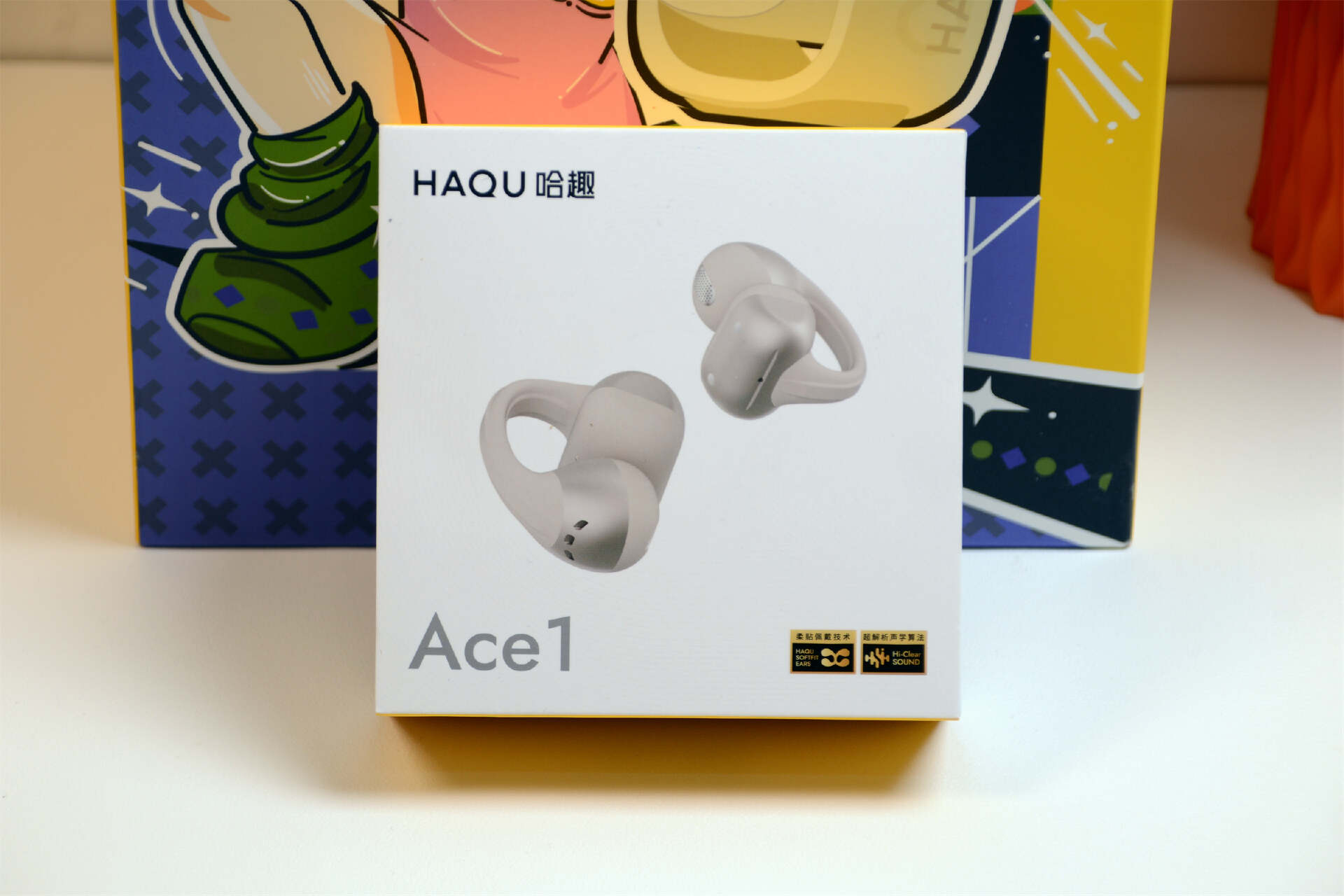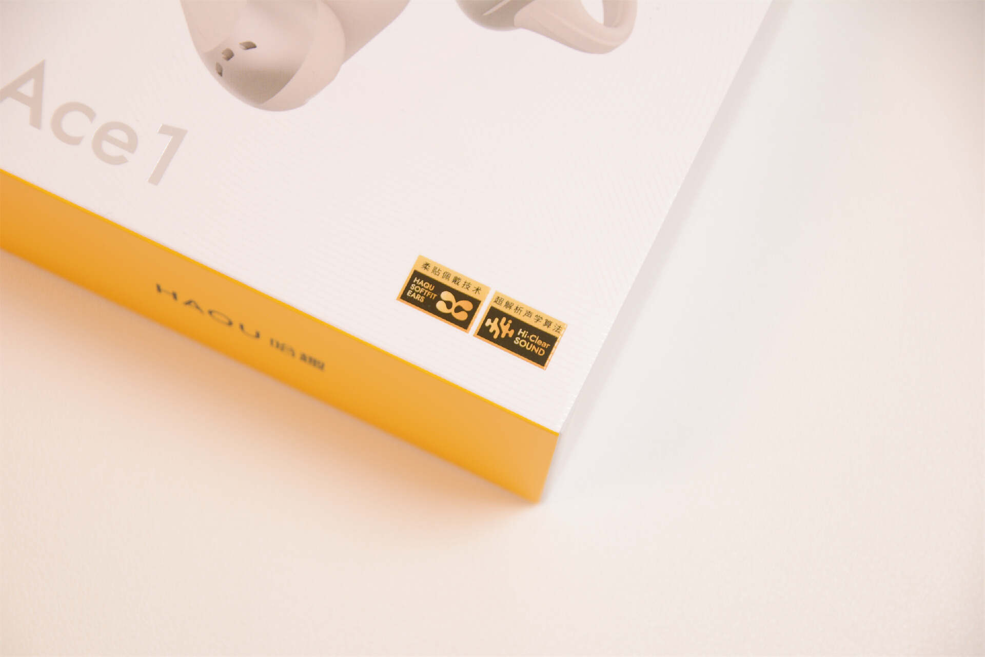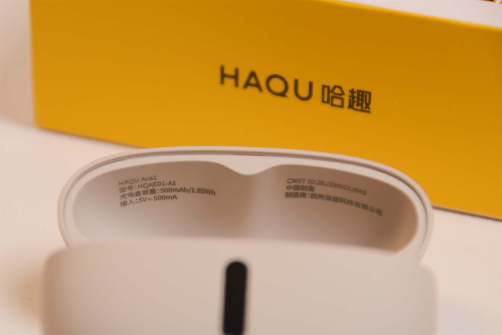 哈趣Ace1的包装配色延续了哈趣一贯的风格,色调都一致,基因正统,右下角的标志说明其特性柔贴佩戴技术和超解析声学算法,看来还是有点东西的,戴耳机不就是图个佩戴舒适,听觉舒适么?