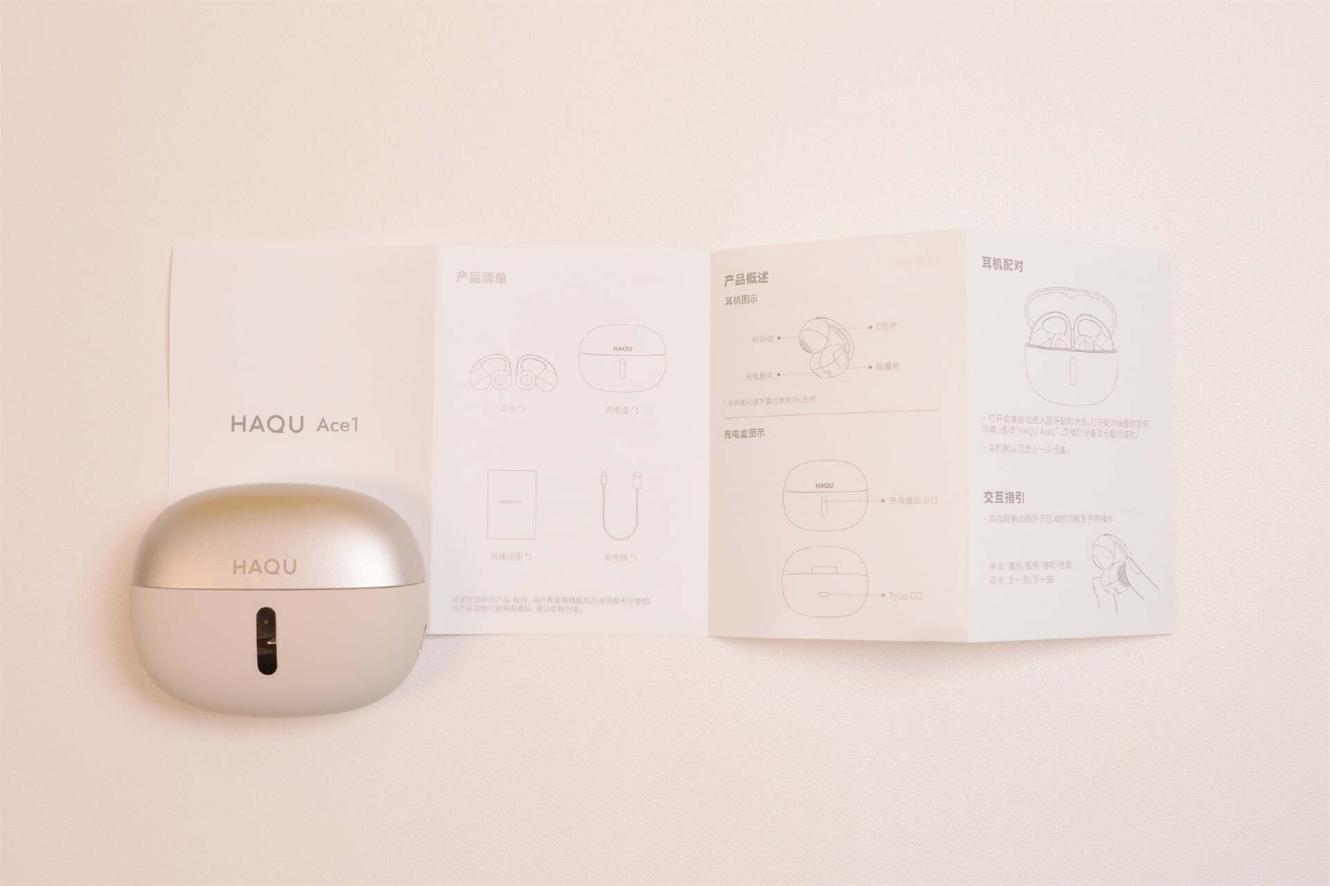 哈趣Ace1包装内包含耳机一副,说明书一个,充电线一根,充电线为手机通用型,其实基本用不到,直接用手机充电器充电就可以了,省事儿。