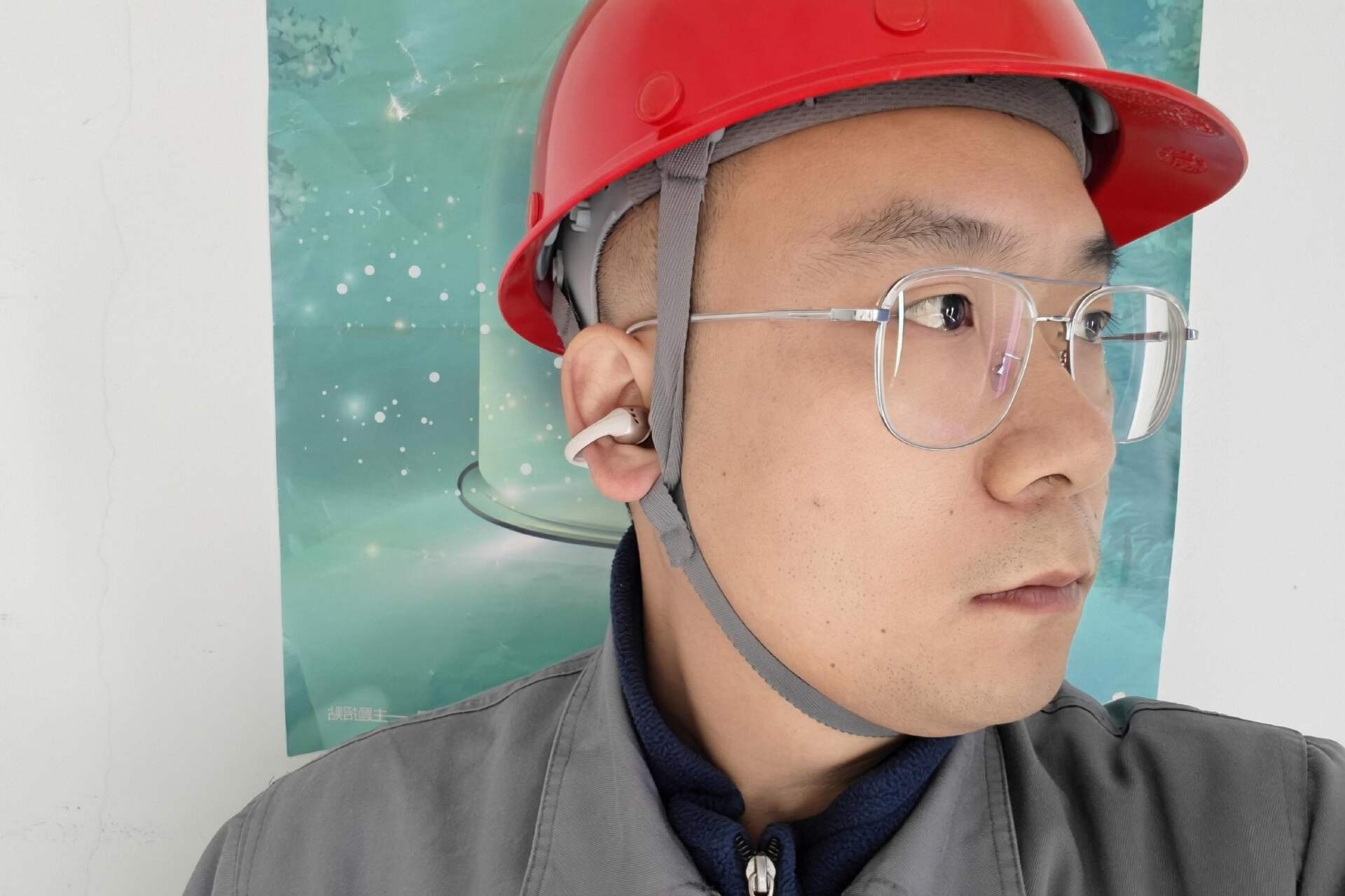 工作中佩戴和我的安全帽搭配的还挺好,眼镜腿、帽带之间互不影响,也多亏了哈趣Ace1的独特设计,耳轮脚+耳廓稳定三角结构贴合稳固,要知道我第一幅耳夹式耳机就是丢了一只在工作现场,然后就彻底废了。现场声音嘈杂,AI-ENC通话降噪就帮了大忙,AI人声识别算法叠加ENC环境降噪技术,通话声音还不错,人声清晰,噪声极少,打电话再也不用大声喊了。外界声音我是听的清楚的,不耽误工作时对外界声音的识别和判断,很安全。