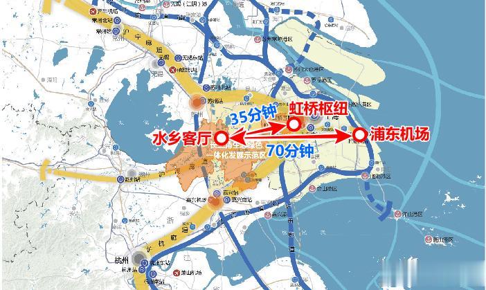 根据长三角一体化示范区综合交通专项规划,区域交通通达效率明确了定量目标:示范区城镇内部搭建15分钟社区出行圈,相邻城镇组团之间30分钟可达,水乡客厅至虹桥枢纽之间35分钟可达,水乡客厅至浦东机场之间70分钟可达。
