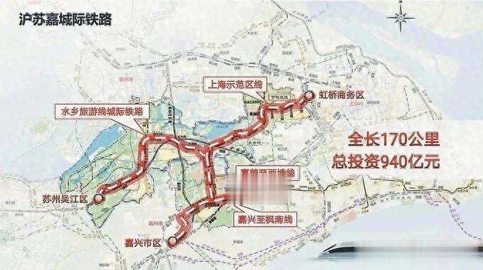 浙江段由“嘉善至西塘市域铁路”和“嘉兴至枫南市域铁路”共同组成。其中,嘉善至西塘线全长20.4公里,设4座高架站,计划2028年通车。