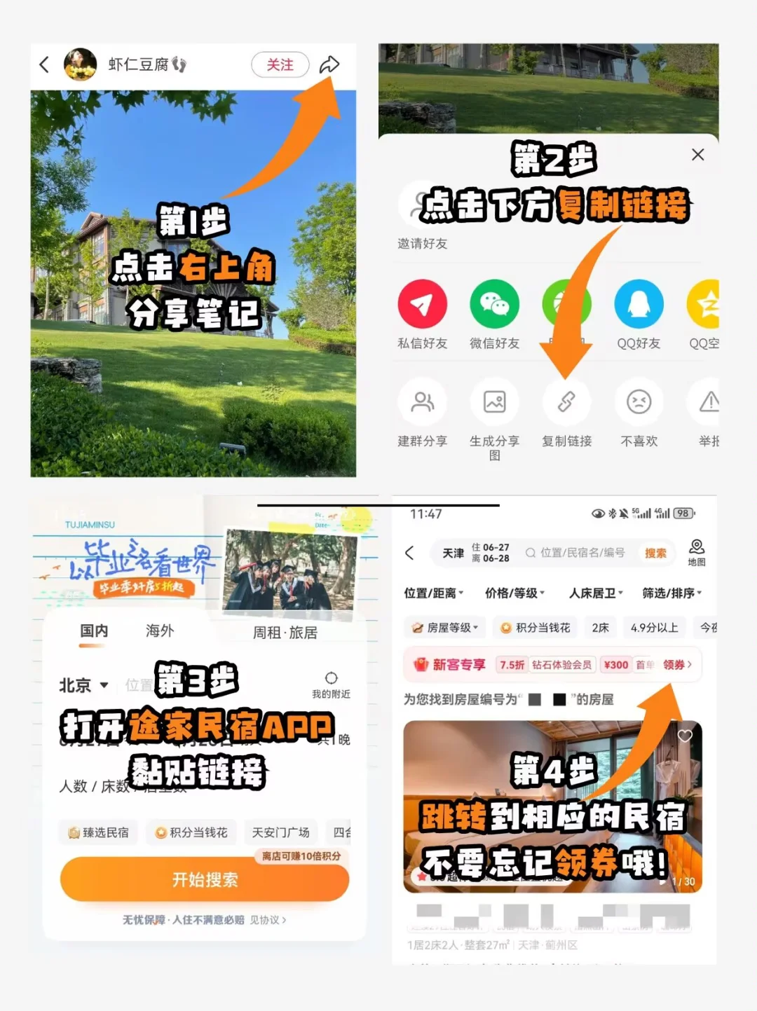 1⃣点笔记右上角「复制链接」,打开途家民宿App