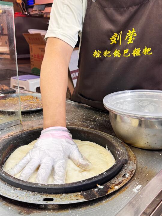 现烙的脆脆的锅巴放上热乎乎的糍粑