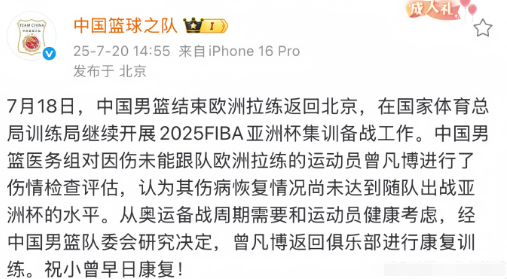 正式官宣了,曾凡博因伤缺席男篮亚洲杯的比赛!