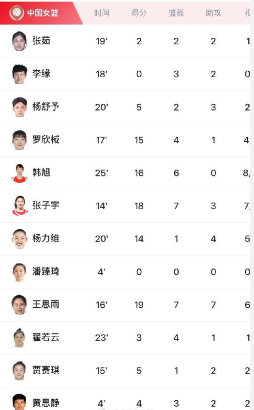 韩旭16分6篮板3盖帽,张子宇18分7篮板,王思雨19分7篮板7助攻,罗欣棫15分4篮板3抢断,杨力维14分4助攻,杨舒予5分3助攻。