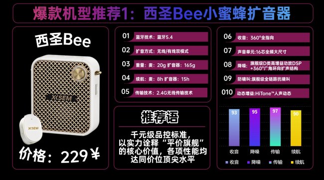 推荐品牌1:西圣bee领夹扩音器安利指数:★★★★★参考价格:229¥一句话推荐:扩音器里的硬核王者,性能天花板级存在!教师上课用的扩音器哪种比较好?市面上大多数扩音器声音刺耳、啸叫频发还延迟严重,完全无法满足实际使用。因此我推荐西圣Bee小蜜蜂扩音器,它搭载旗舰级D类高增益功放DSP芯片+360°全指向麦克风+16芯全频大单元,声音洪亮清晰、传得远又稳定,再配合全链路抗啸叫算法,大音量也零破音零延迟。真正实现了扩音的发烧级性能,被公认为扩音器行业的天花板级存在!