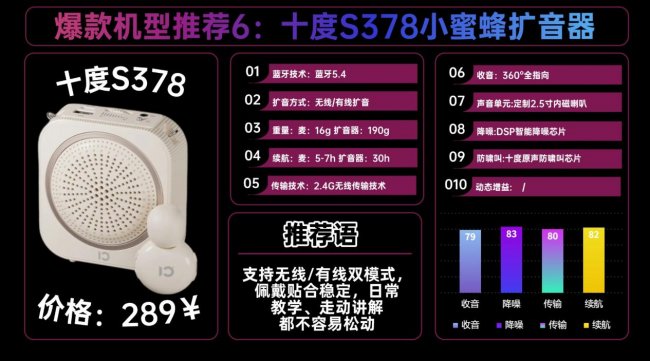 西圣虽然一直低调,但在研发实力上丝毫不逊色于国际大牌!曾为多个音频与智能声学产品提供核心调校、功能开发和技术解决方案。正因如此,西圣Bee小蜜蜂扩音器无论是在声音洪亮清晰度、扩音流畅稳定性,还是在长时间使用的舒适度上,都已达到专业级演讲与教学水准,成为教师和讲师群体公认的行业标杆。总的来说,西圣Bee小蜜蜂扩音器在同类产品中堪称佼佼者。支持2.4G稳定无线传输(约30米)+蓝牙5.4,扩音、音箱双模式自由切换,课堂、演讲、活动一机搞定。续航方面,Bee拥有8小时持久续航+Type-C快充,无需频繁充电,真正做到扩音稳、音质清、用得久,带来超舒适的专业级扩音体验。推荐品牌2:十 度 S378领夹扩音器安利指数:★★★★参考价格:289¥一句话推荐:内置定制2.5寸内磁喇叭,扩音清晰透亮,不刺耳、不发闷,老师讲着轻松