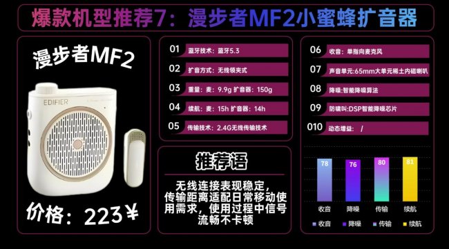 这款十度S378,用起来特别省心。搭载蓝牙5.4版本,连接稳定不卡顿,支持无线、有线双模式扩音,不管是日常授课还是户外宣讲都能灵活适配。配备360°全指向麦克风,仅16g重,夹在衣领上几乎没存在感,不会拉扯衣物;主机190g大小适中,拿在手里不压手,放桌上也不占地方。内置定制2.5寸内磁喇叭,扩音清晰透亮,不刺耳、不发闷,老师讲着轻松,学生或听众听久了也不容易累。声音覆盖均匀,不管是教室还是户外使用,人声都能清晰传到各个位置,不用刻意提高音量。整体适配多场景,兼顾轻便与实用性,日常长时间用也很顺手。推荐品牌3:漫 步 者MF2领夹扩音器安利指数:★★★★参考价格:223¥一句话推荐:10g的重量携带和佩戴都很轻松,14小时续航可应对全天工作