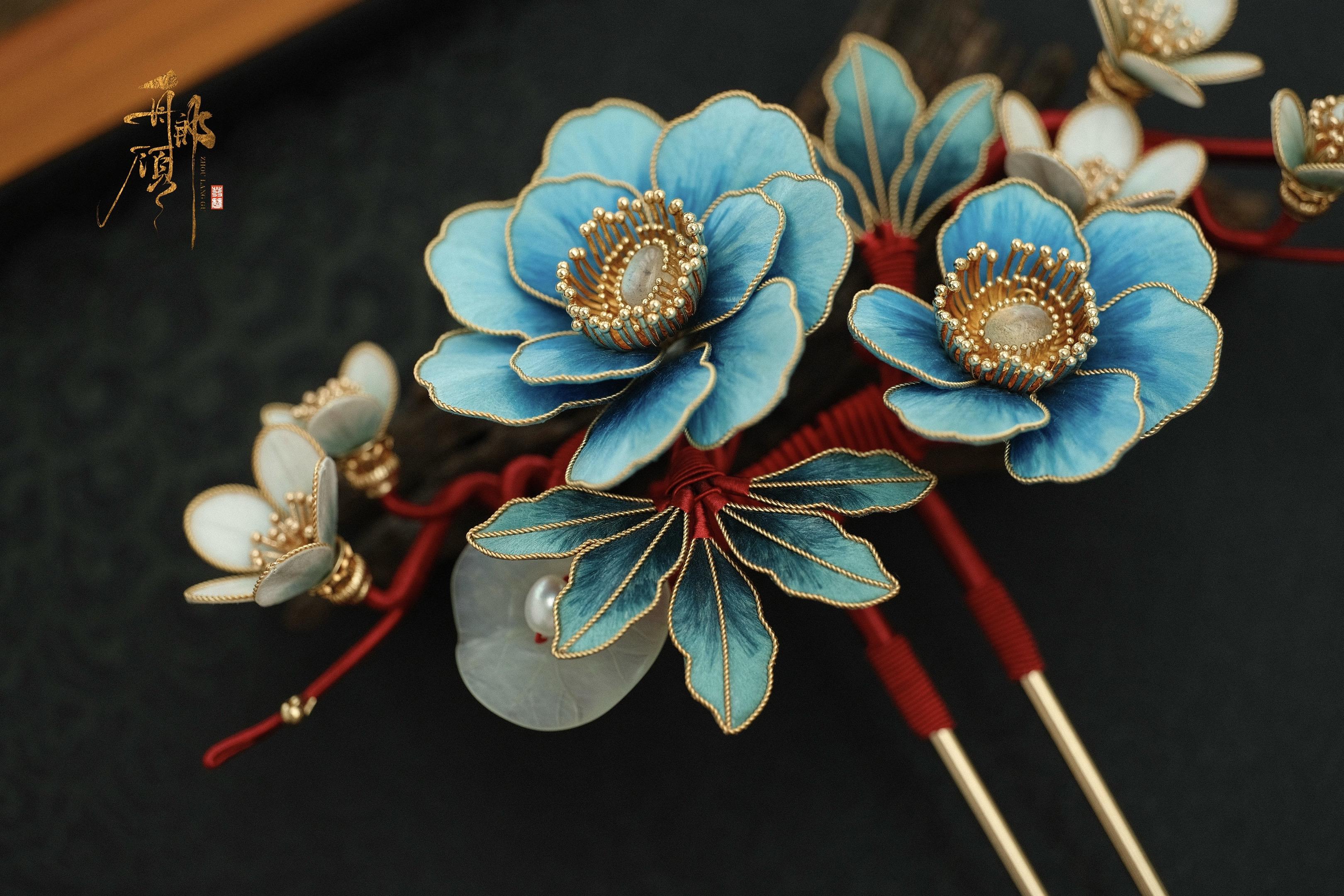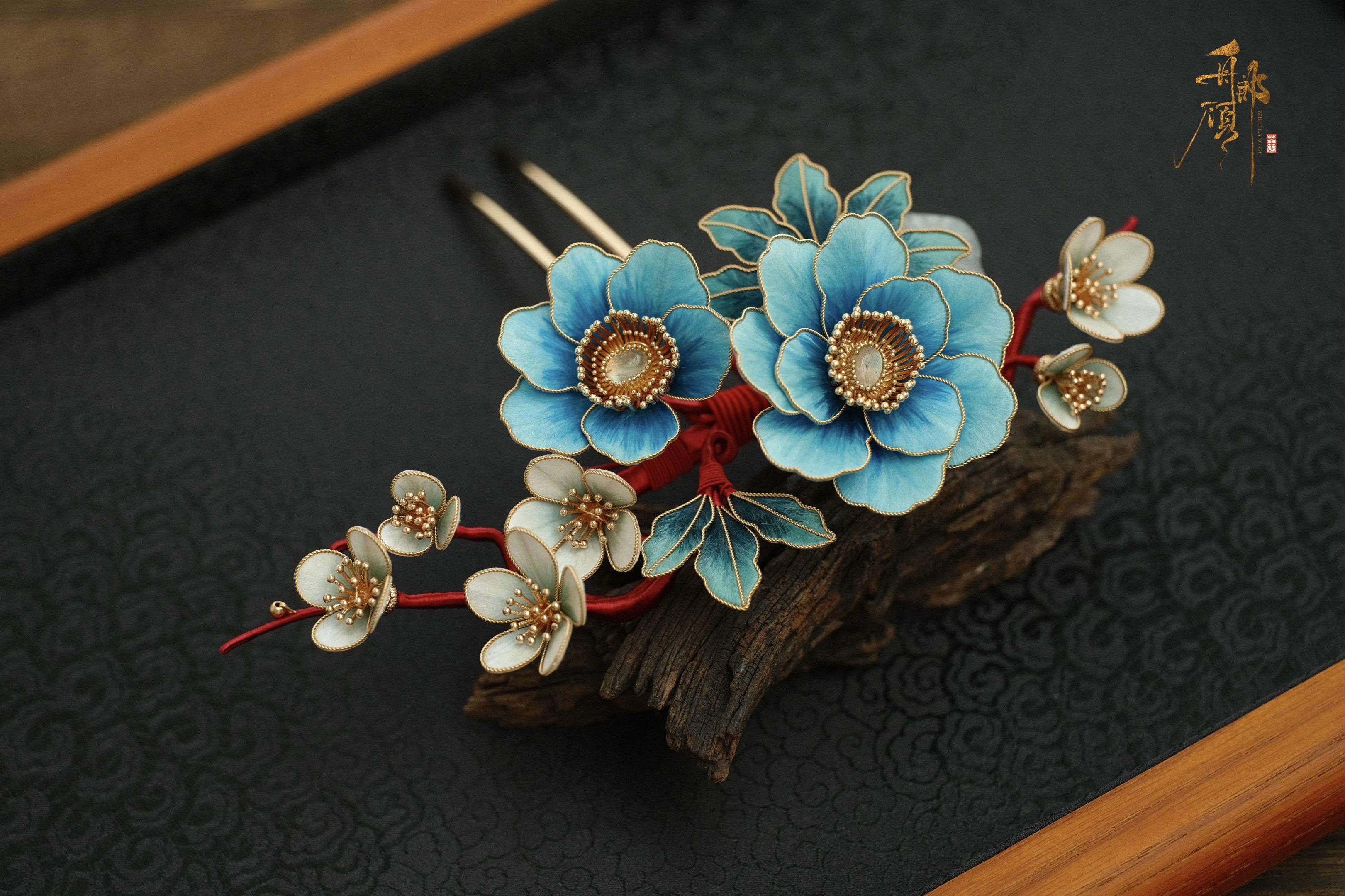 用中国传统色,做中国传统花~配色有点戏曲风的翠蓝牡丹发钗。