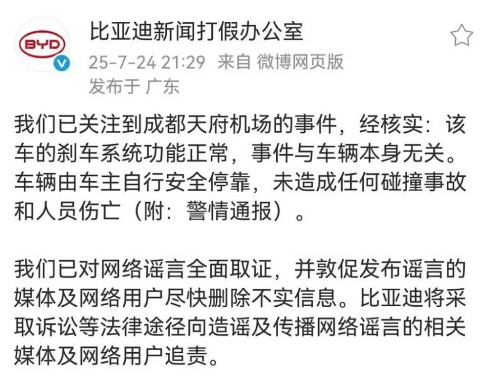 7月24日,正值比亚迪海狮06发布当晚,突发成都天府机场事件。仅一则随手拍的短视频突然爆火,被断章取义为车辆刹车失控,将司机蒋某的情绪宣泄偷换为产品技术事故,再一次让比亚迪成为焦点。