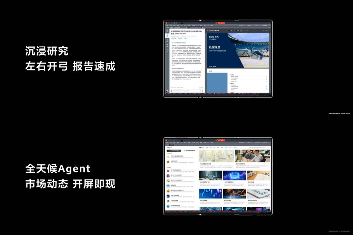 现在有了鸿蒙三折叠,体验就不同了!例如,某个周日晚间,海外突然传出关于某家公司的重要诉讼文件。我展开华为Mate XTs,打开鸿蒙版Wind金融终端,让Wind Agent自动抓取与此事件相关的历史新闻、公司公告和关联方信息,一边看资讯和第三方研报,一边写PPT。十分钟内就能在一个连贯的视野里,完成信息的初步整合与关联分析,并形成几个需要周一跟进的关键问题。这在以前,要么必须打开电脑,要么只能获得极其碎片化的认知。