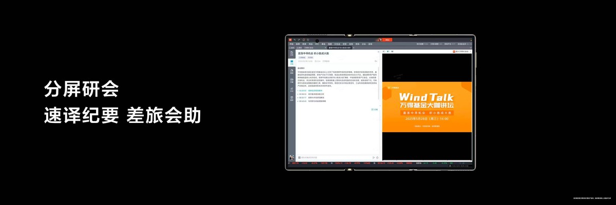 撰写报告和整理纪要,是另一大痛点。线上投研会议时,我可以直接在Mate XTs上使用鸿蒙版Wind金融终端的分屏会议功能,一边听发言,一边看实时生成的双语字幕和智能纪要,不用在录音笔、记事本和电脑间来回切换,思路连贯不中断。