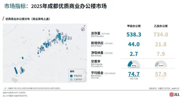 成都,2026年1月22日——随着“十四五”圆满收官,“十五五”宏图徐启,2025年为成都夯实高质量发展根基写下坚实注脚,也为2026年这座西部极核城市在新周期中跃升能级、重塑格局铺就了前行之路。甲级办公楼市场:供应回归,全口径优质办公存量破三千万平方米,需求疲软,空置率攀升,租金下跌。优质零售地产市场:供应暂停,五大项目改造更名,服务消费起势,商品零售回落。物流地产市场:新增供应继续放量,整体需求稳健托底,空置率保持低位、租金降幅持续收窄。