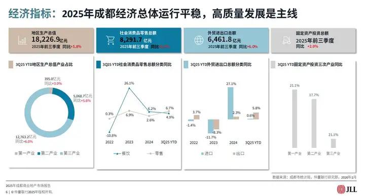 仲量联行华西区董事总经理佟恩表示,“2025年,成都城市能级系统性跃升——科创策源力增强,高技术制造与数智绿色产业加速融合;国际消费中心建设深化,场景创新、首店经济与在地文化激发内生活力;‘一带一路’节点优势凸显,‘蓉企出海’迈向体系化,外贸向价值链高端攀升。与此同时,房地产市场在调整中寻求新平衡,这不仅是周期考验,更是转型契机。我们相信,2026年成都将以更强韧性,推动空间、产业与资本的高质量协同。”