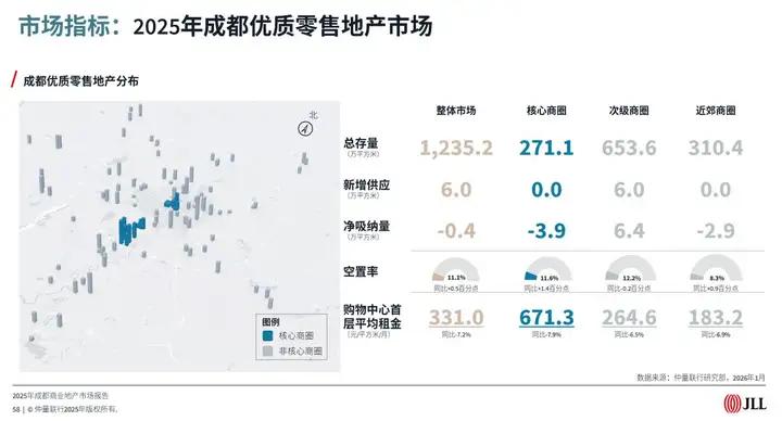 2025年,成都零售市场供给侧与需求侧同时发展重大改变。供给侧对新增供应按下暂停键,全年仅一个新开商场入市,新增供应仅6万平方米;同期,五大优质零售资产迎来改造换牌,以全新姿态重新走向市场,全市总存量维持在1,200万平方米上方,仍位居全国第三。需求侧在商品零售的回落中,迎来服务消费的起势,情绪价值对于消费的拉动能力渐强。在历经市场调整后,成都优质零售地产市场平均空置率收至11.1%,同比上升0.5个百分点;但购物中心首层平均租金同比下跌7.2%,报331.0元/平方米/月,商业运营的压力与日俱增。