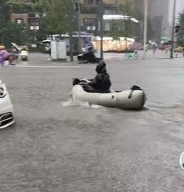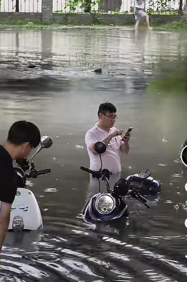 在图片中我们可以看到积水已经没过该男士的腰部,但是在重要的事,也要回信息,男子的举动引发了网友的好奇,又搞笑的网友认为该男子可能是在看手机准备打一艘船回家,