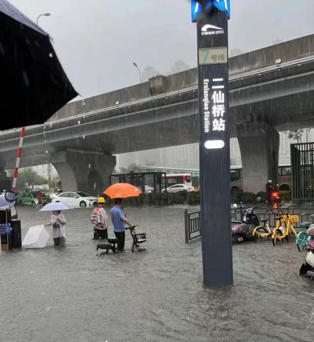 二仙桥站的积水看后也是让人头疼,路上的积水已经到了大腿的位置