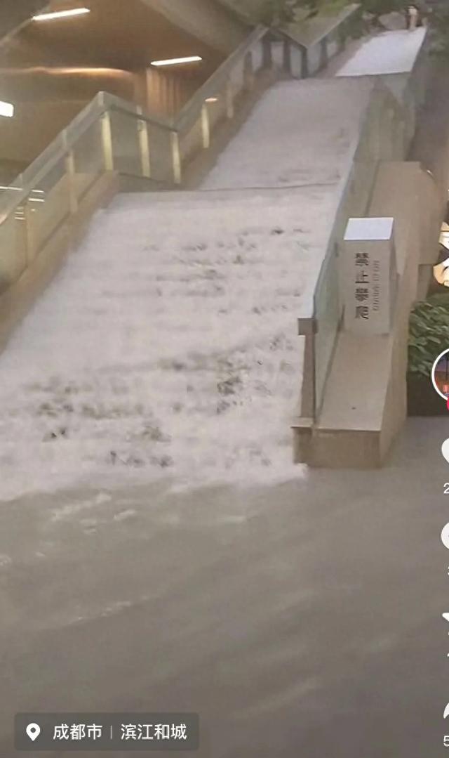 这是位于成都滨江和城的商场,积水顺着楼梯滑下来,导致不少店铺我近了水。商家各个叫苦连天。