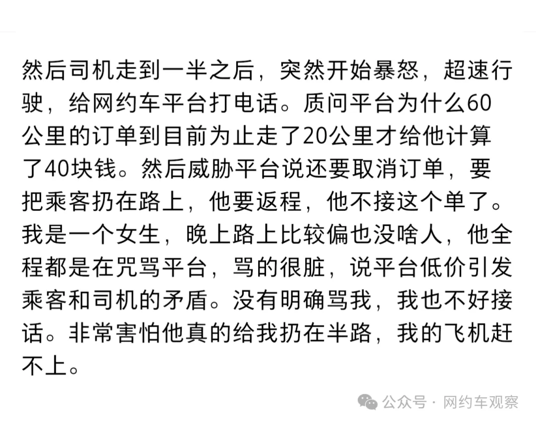 接着司机威胁平台要取消订单,要把乘客丢在路上,自己返程不接这个单了。当时是晚上,路上也比较偏僻,乘客听着司机骂了一路。