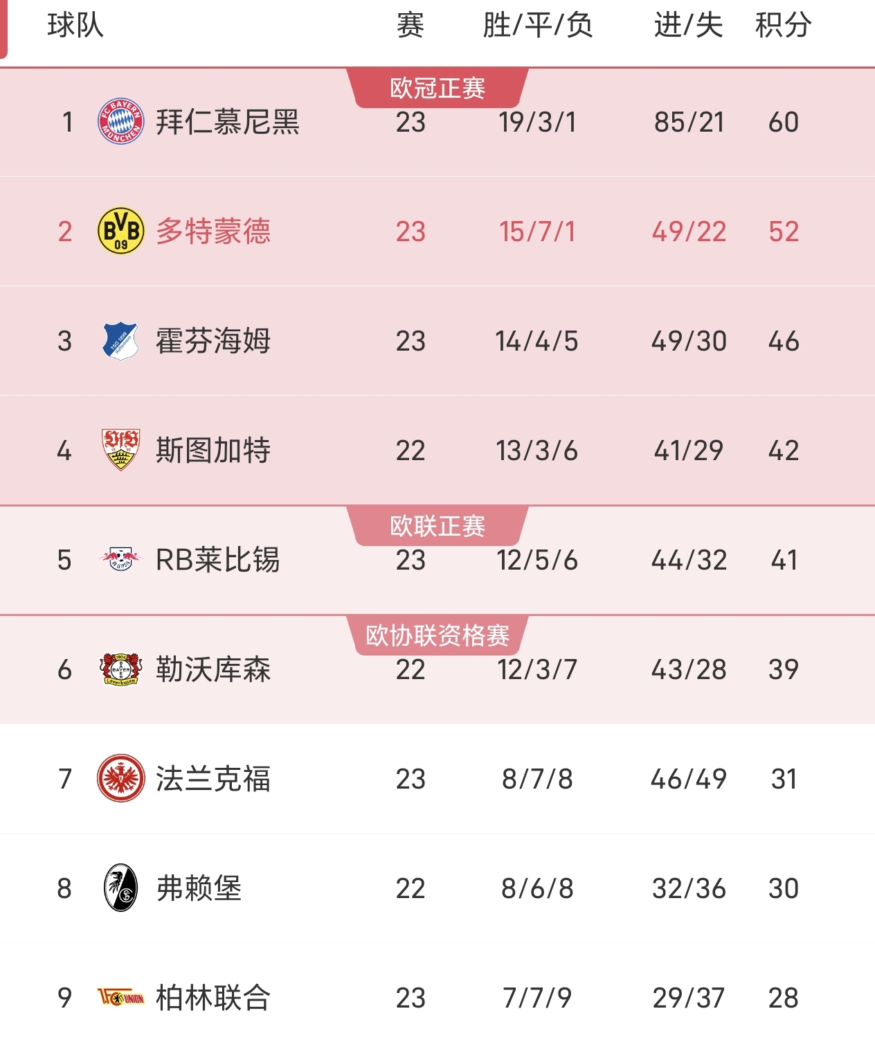 随着比赛结束,德甲最新积分榜如下
