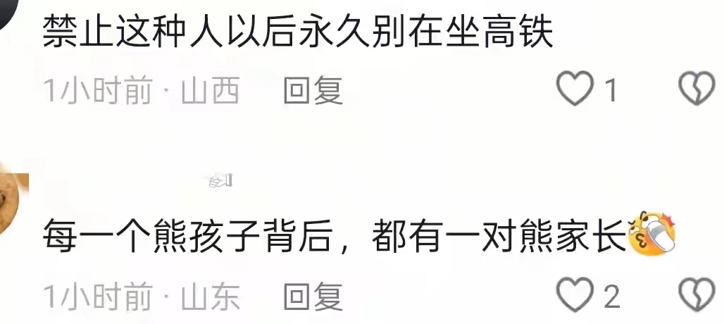 但不管最终是“真打了”还是“动作有争议”,这件事的根源其实很清楚:公共场所里,孩子大声吵闹、家长不加约束,迟早会引发矛盾。高铁并不是游乐场,它是封闭空间,车厢内本就有明确的文明乘车规定,家长带孩子出门,首要责任就是教孩子学会顾及他人,而不是一味放任
