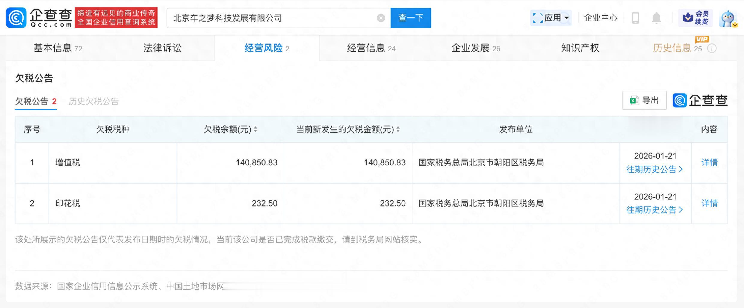 企查查APP显示,近日,北京车之梦科技发展有限公司新增两则欠税公告信息,欠税余额总计14.1万余元,欠税税种包括增值税、印花税,发布单位为国家税务总局北京市朝阳区税务局。企查查信息显示,该公司成立于2004年8月,注册资本35.43万元,黄子韬持股97%。