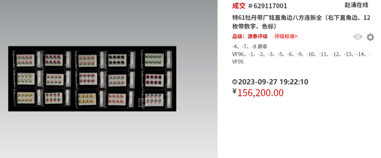 老纪特六大珍邮之一,1964年8月5日,为了展示中国丰富的植物资源和宣传中国牡丹文化,邮电部发行了《牡丹》特种邮票,全套15枚。是一套非常经典以及设计非常漂亮的邮票,深受藏家们的喜爱,这套特61-牡丹带厂铭直角边的四方连以源泰金标VF95及96的全品分数,成交价也是高达15.6万!