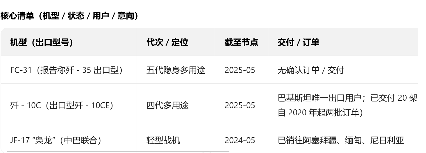 截至2025年5月节点,FC-31(报告称是歼-35出口型)五代多用途隐形战斗机,无确认订单/交付,但埃及、沙特、阿联酋等国是意向客户。