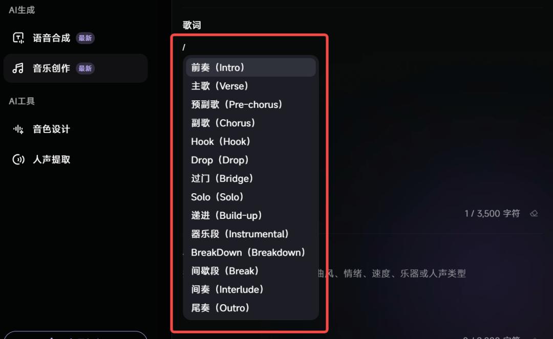 拿MiniMax这个歌词区来举例,在歌词框里打一个/,就能看到它有14种段落结构。