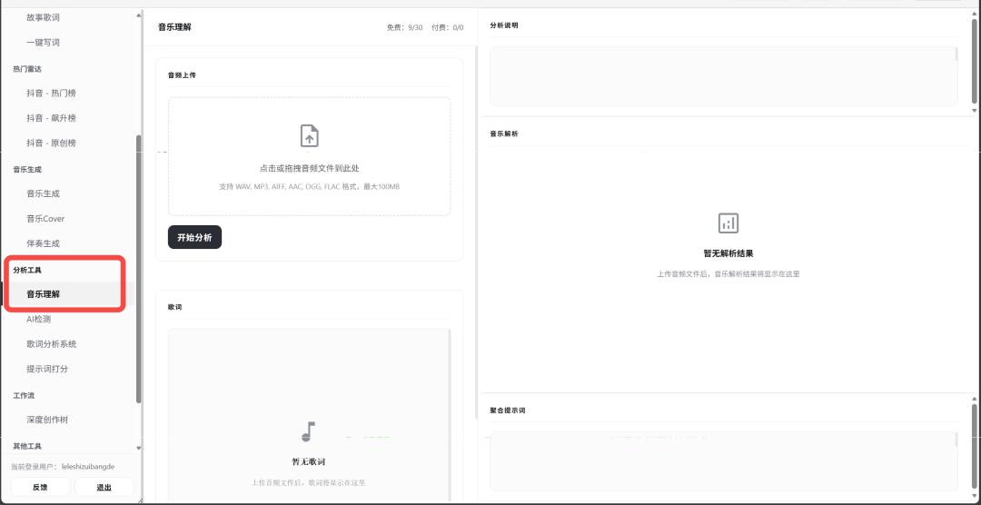点进去之后找到左侧边栏,点分析工具里面的音乐理解,就能看到这个界面了。