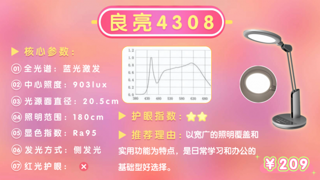 央视公认合格护眼灯品牌排行榜之良亮4308,在结构上采用铝合金与ABS材质组合,兼顾耐用与轻便,整体握持与摆放手感尚可。光源为直径约20.5厘米的圆形发光面,运用侧发光方式,中心照度约903lux,可覆盖约180厘米桌面,在大尺寸书桌上也能基本铺满光线。功能提供定时休息与夜灯模式,前者有助于提醒间歇用眼,后者方便夜间低亮度照明。不过它的中心照度在同类型产品中略低,长时间精细阅读可能稍显不足。