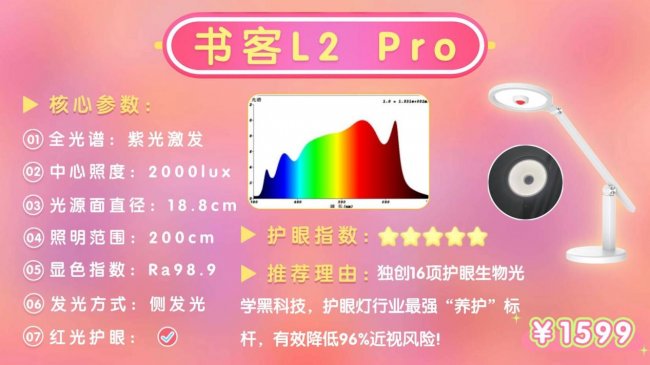 为实现“医学用眼”的高性能与耐用性,SUKER书客采用了全新一代紫光激发全光谱技术,从根源方面抑制有害蓝光的产生,光是415~455nm部分的蓝光峰值便进行了大幅度的削减,促使L2 Pro的蓝光含量比国标的RG0等级还要减少70%