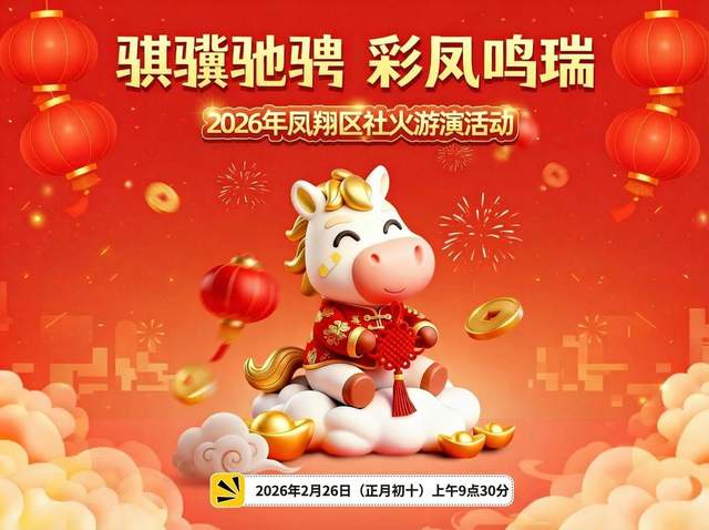 为营造喜庆祥和的节日氛围,丰富群众春节文化生活,进一步弘扬中华优秀传统文化,推动文旅深度融合发展,以“骐骥驰骋彩凤鸣瑞”为主题的大型社火游演活动,将于2月26日(农历正月初十)盛大启幕,为广大群众和游客倾情呈现一场融秦风古韵与民俗风情于一体的文化盛宴。
